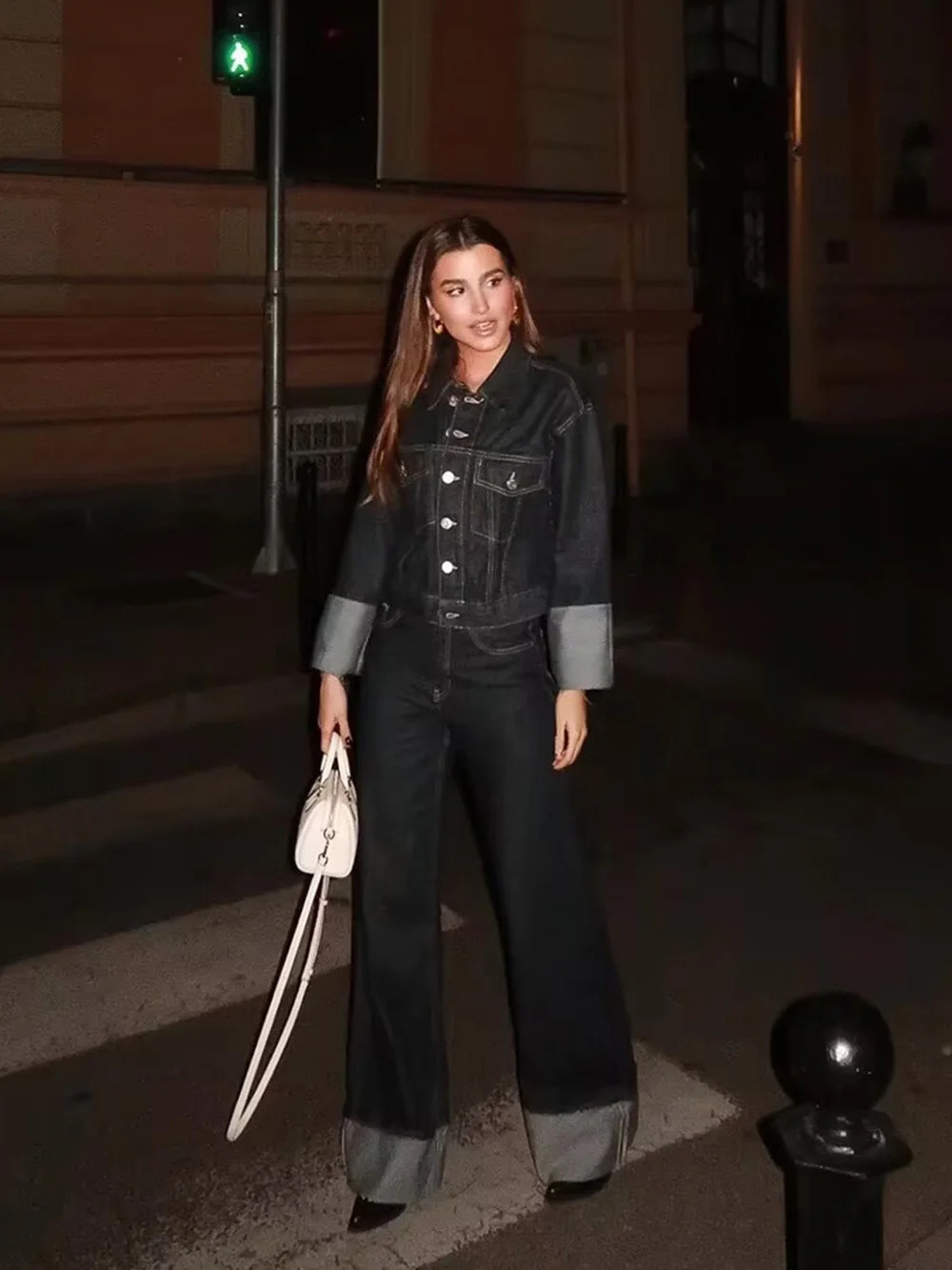 The jacket features a modern fit with rolled edges, while the pants showcase subtly flared hems for a contemporary silhouette. Crafted from high-quality polyester (90%–95%), the set is durable, soft to the touch, and easy to maintain, ensuring both comfort and long-lasting wear. Its versatile denim tone allows for multiple styling options, making it a perfect wardrobe staple.