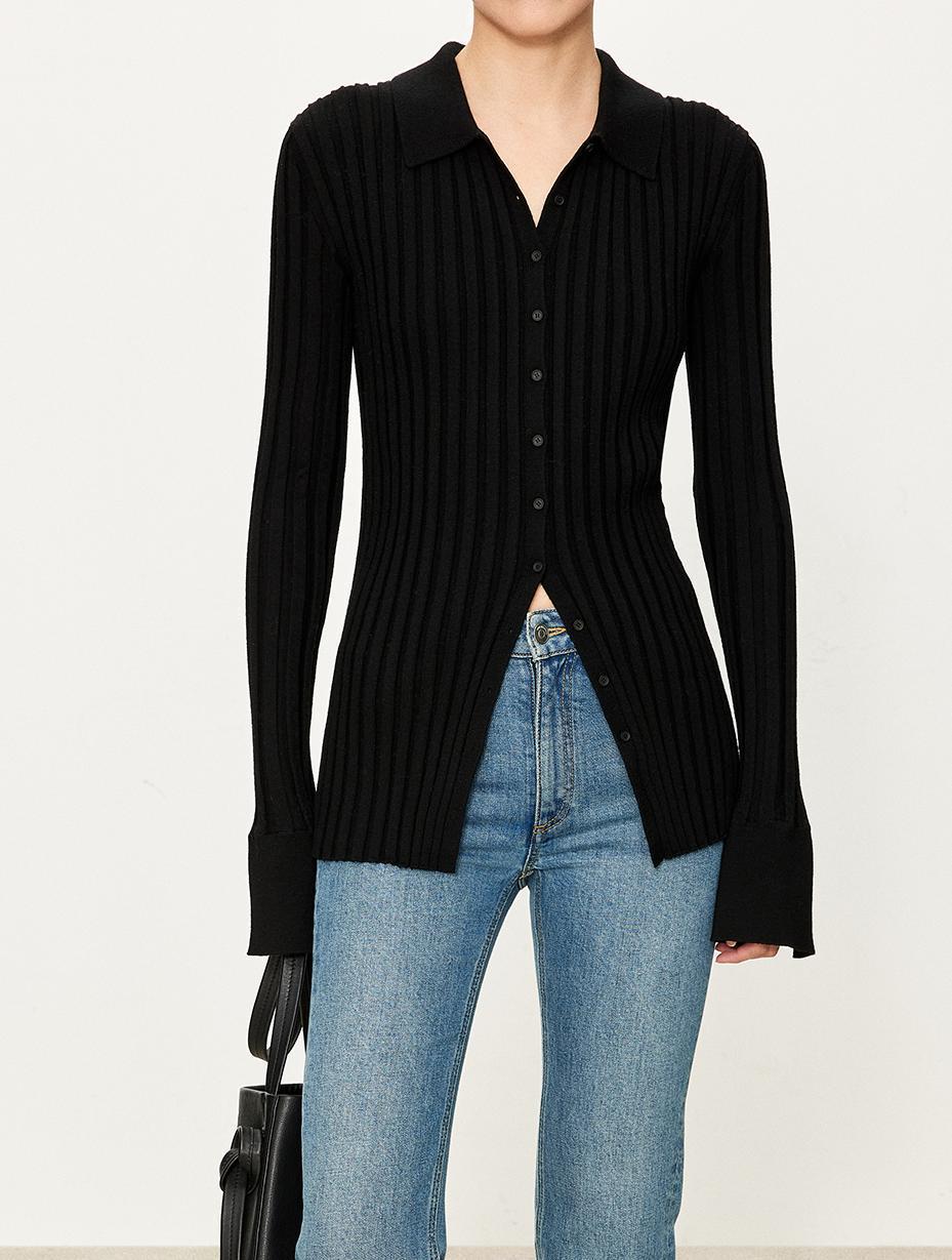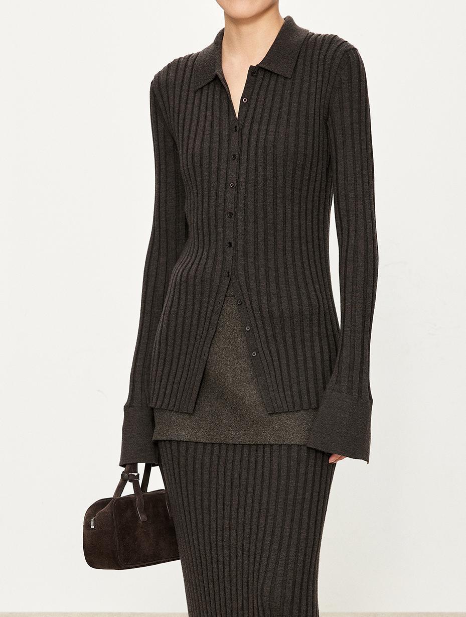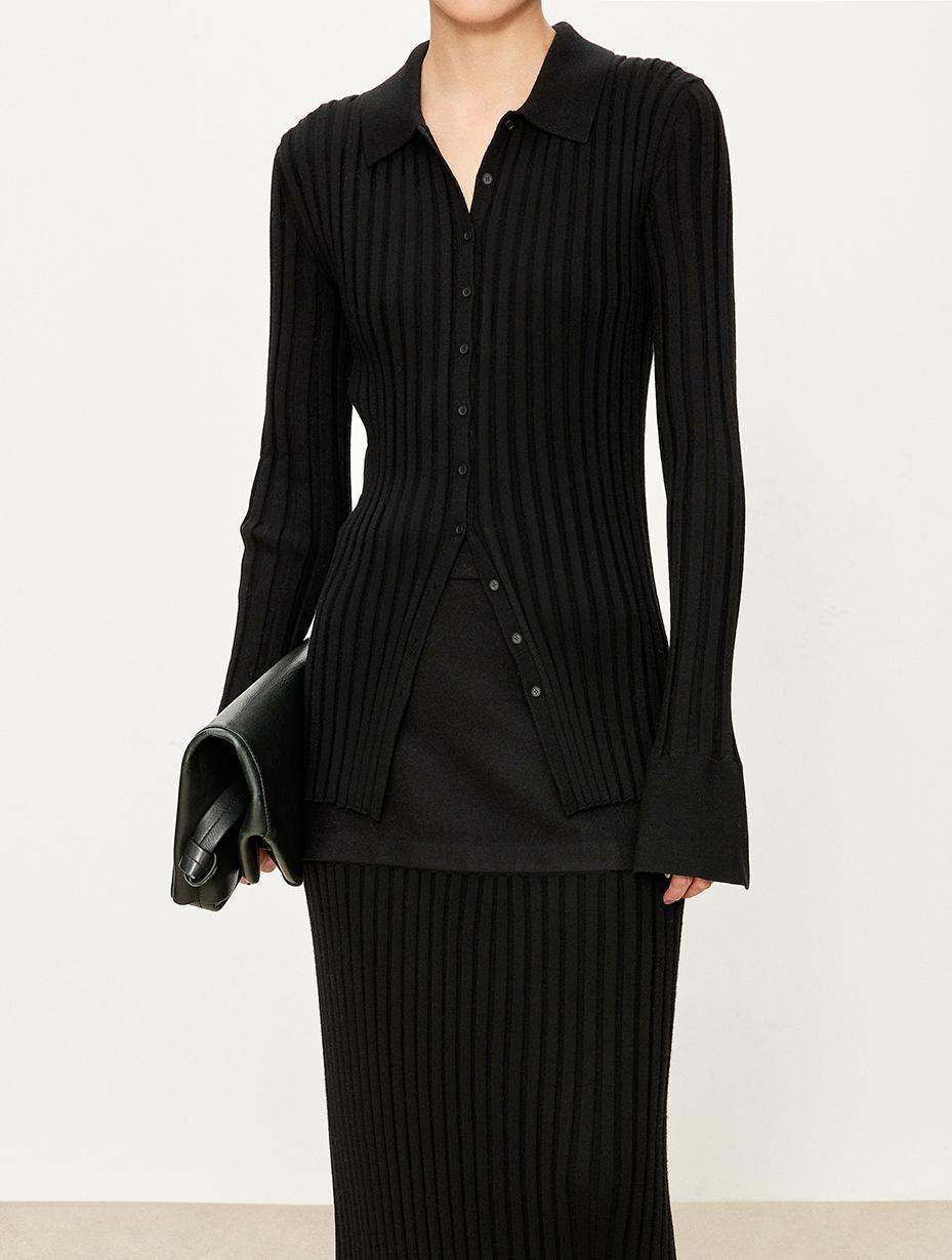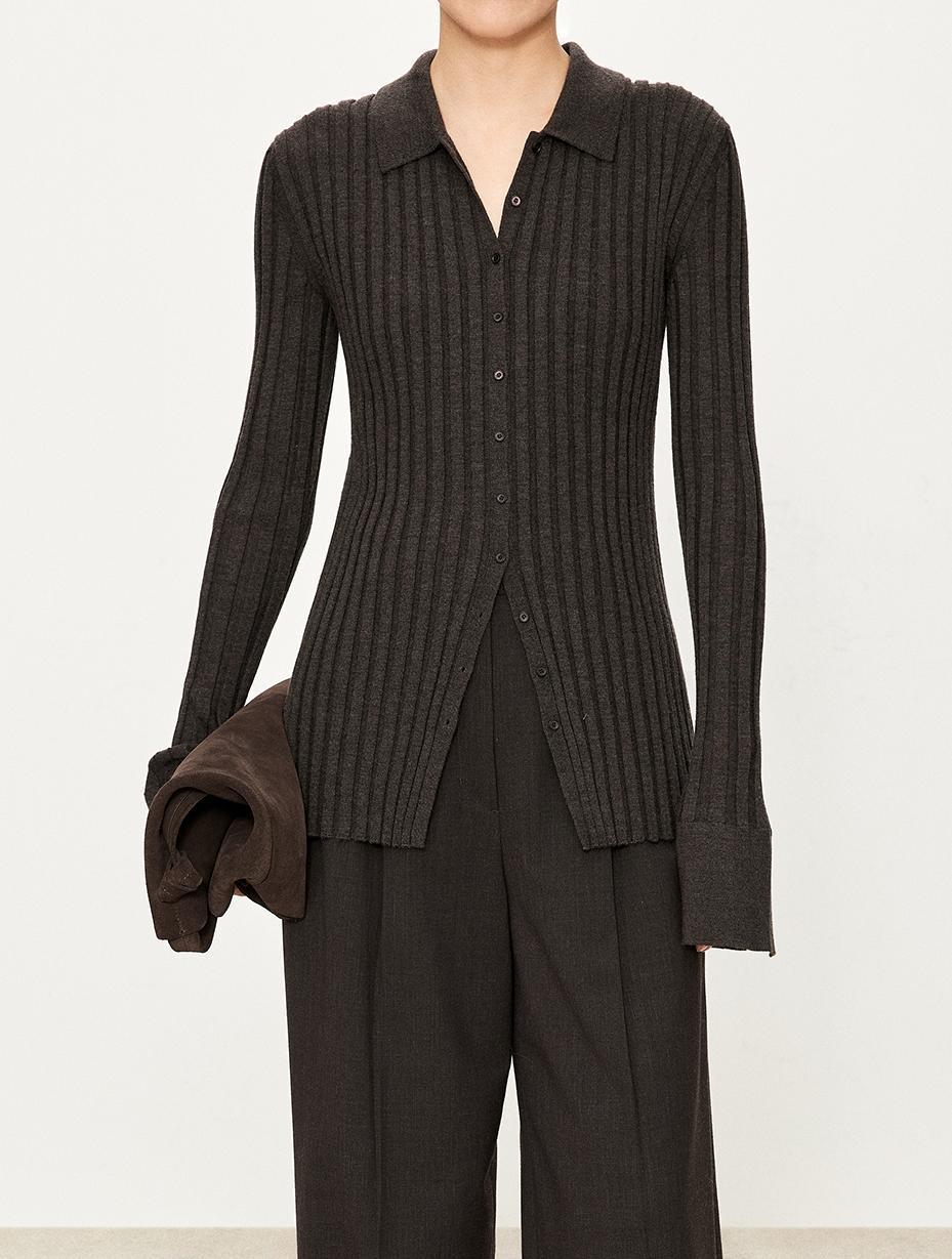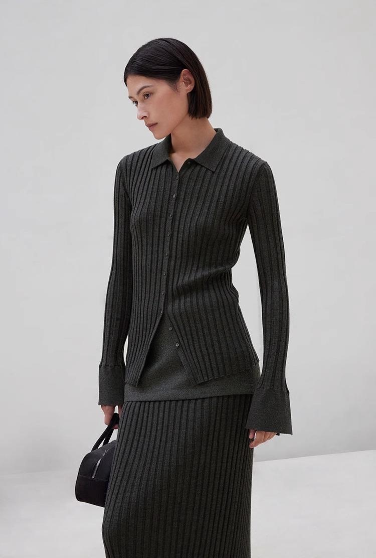 The TYRA Ribbed Wool Polo is crafted from ultra-fine premium wool, designed for understated elegance and everyday refinement. Its sculpting ribbed texture creates a clean, elongated silhouette, while the minimalist polo collar adds a timeless, effortless character.