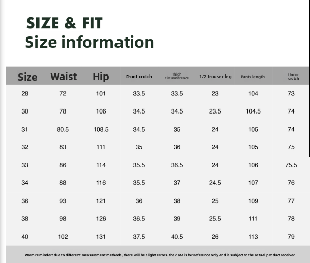 • Sizes: 28, 30, 31, 32, 33, 34, 36, 38, 40