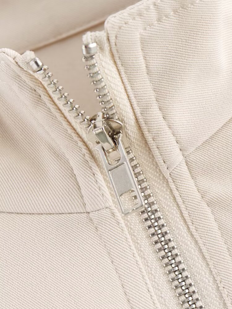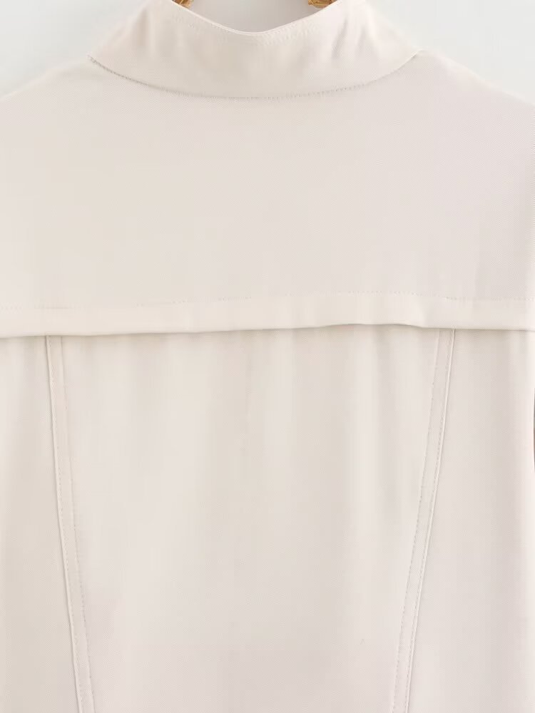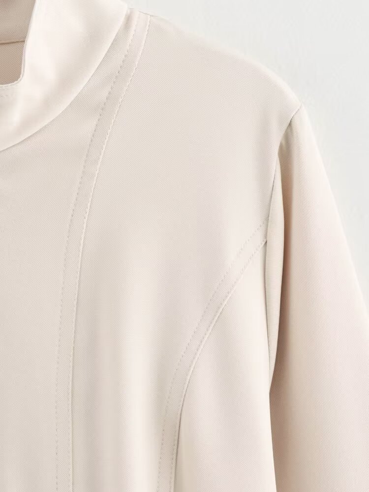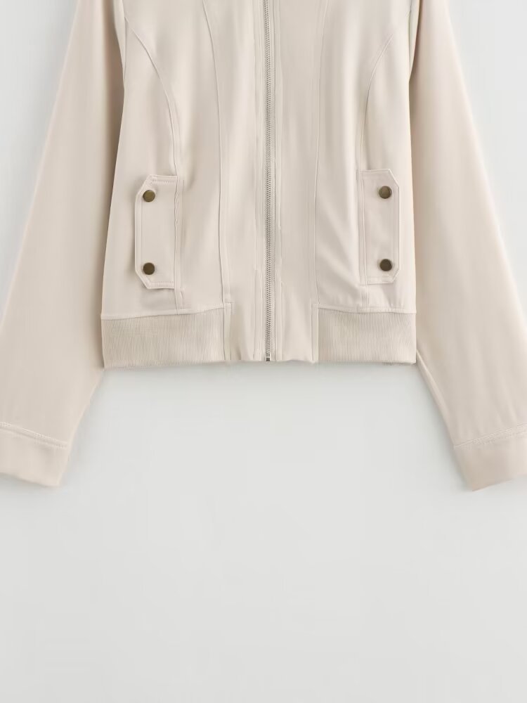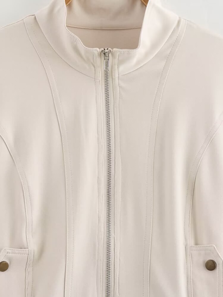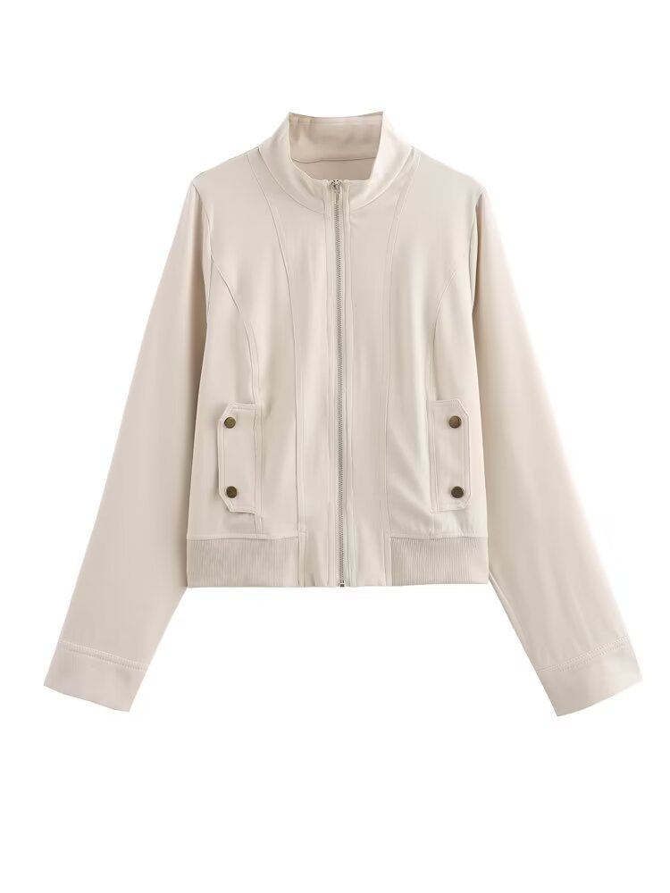 Designed with a slim, flattering silhouette, this jacket enhances the natural lines of the body while ensuring ease of movement. The stand collar and long sleeves lend an elegant, contemporary feel, complemented by zipper pocket accents that add both practicality and refined detail.